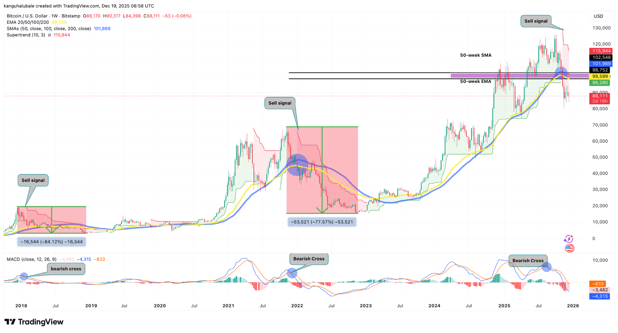 Bitcoin’s weekly chart shows that the SuperTrend indicator flashed a bearish signal, with its “sell” signal confirmed by BTC’s drop below the 50-week moving averages (MAs) (see chart below), a scenario that has historically marked the end of bull markets.