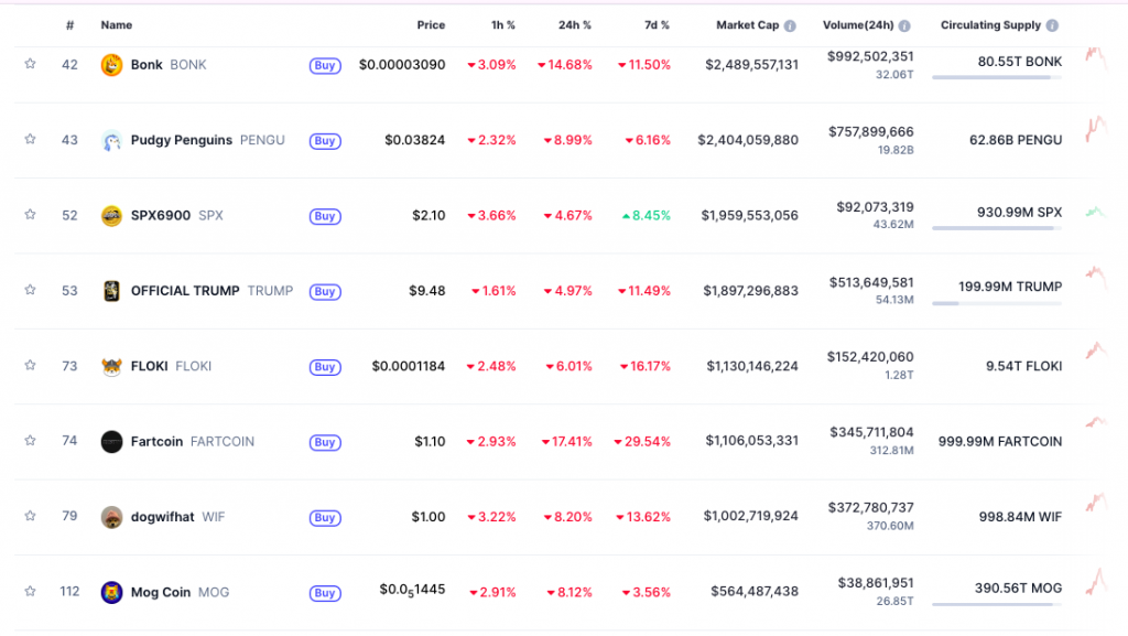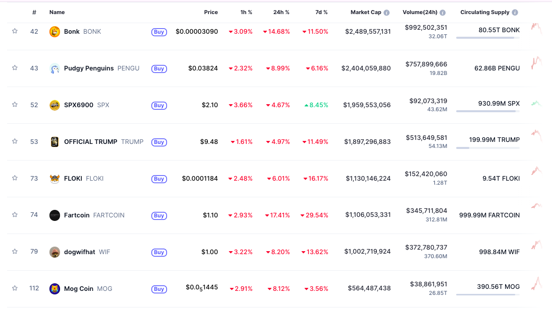 The price crash has cost FARTCOIN its position as Solana’s leading memecoin, with BONK reclaiming the top spot. FARTCOIN now ranks fourth in the Solana memecoin hierarchy, trailing behind PENGU and TRUMP.