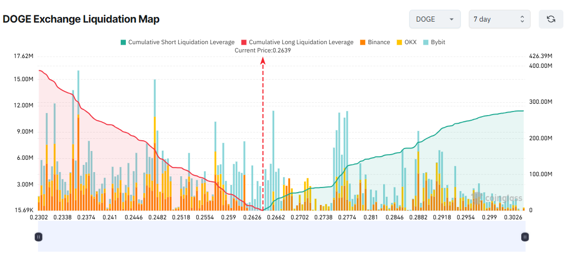 At the time of writing, DOGE has fallen from its July high of $0.28 to $0.266. The 7-day liquidation map shows that if DOGE drops to $0.236 this week, total cumulative long liquidations could reach $300 million.