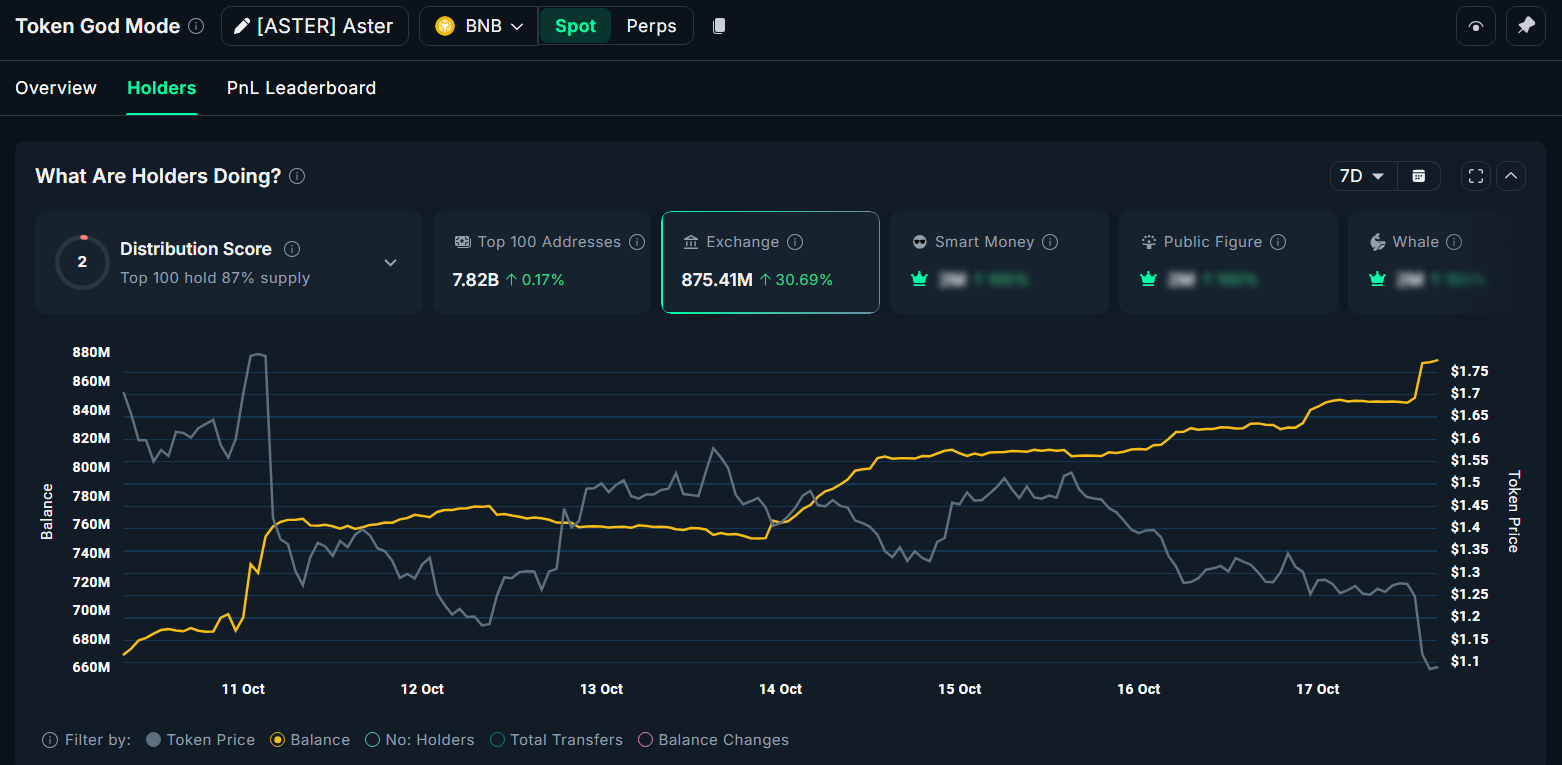 Data from Nansen shows that Aster (ASTER) has seen a sharp increase in exchange supply, climbing from around 670 million to over 875 million tokens in the past week — a more than 30% rise.