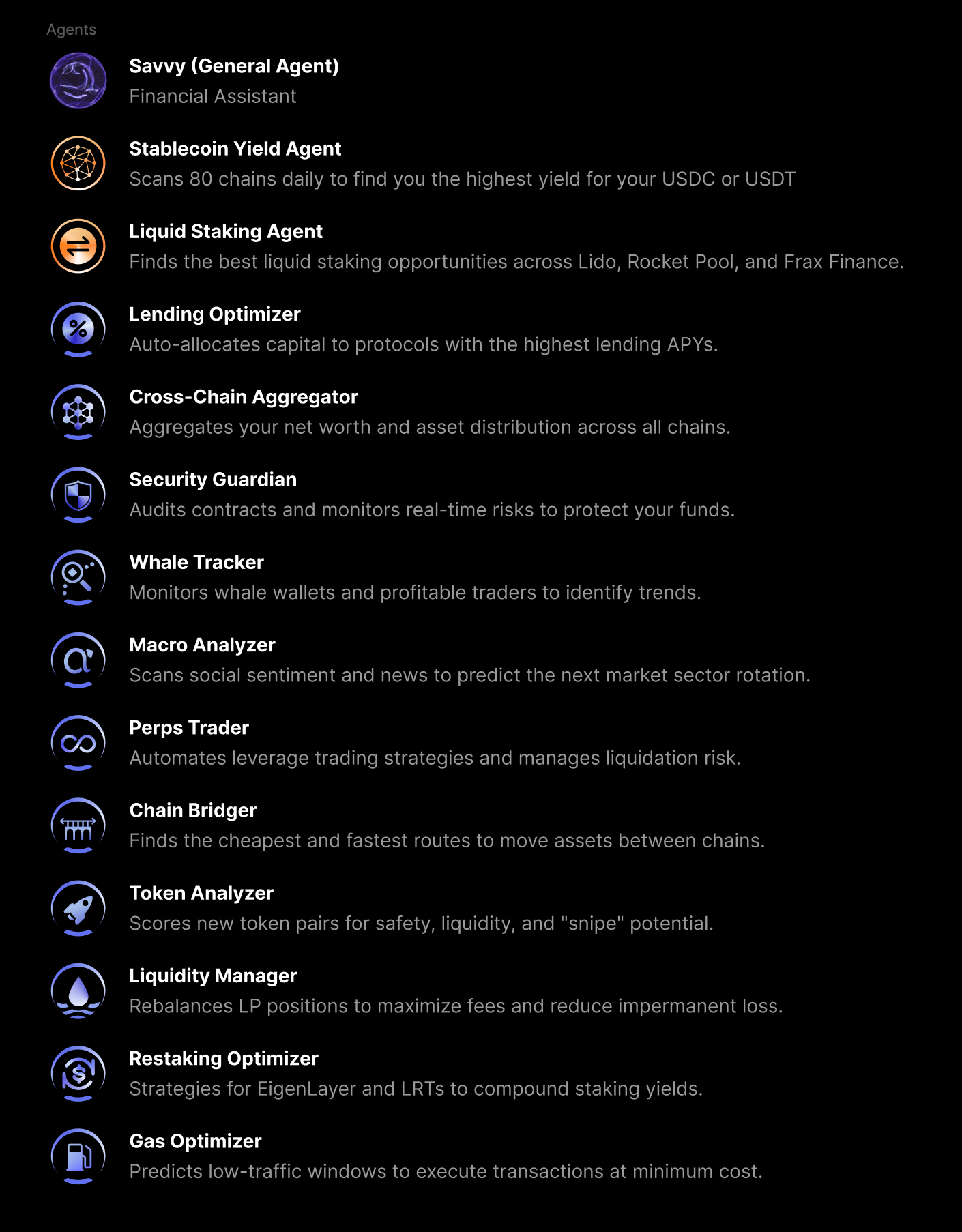 There’s a Staking Agent to show where to get the best, safe yield staking your tokens. Or the Stablecoin Yield Agent does the same for your stablecoin holdings.