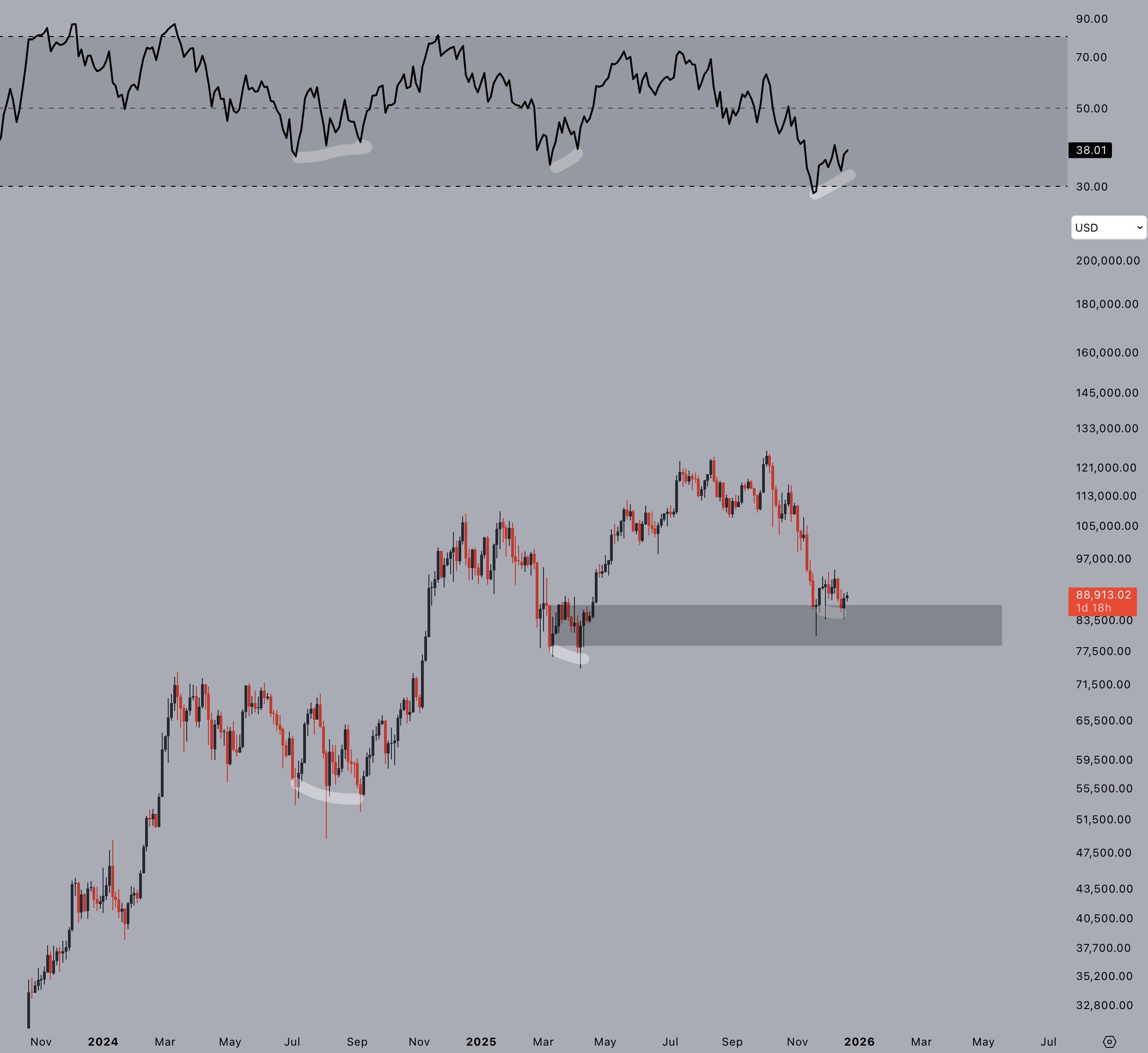 This pattern also appeared ahead of the mid-2021 correction low and the FTX-driven bottom in 2022, both of which preceded multi-month recoveries.