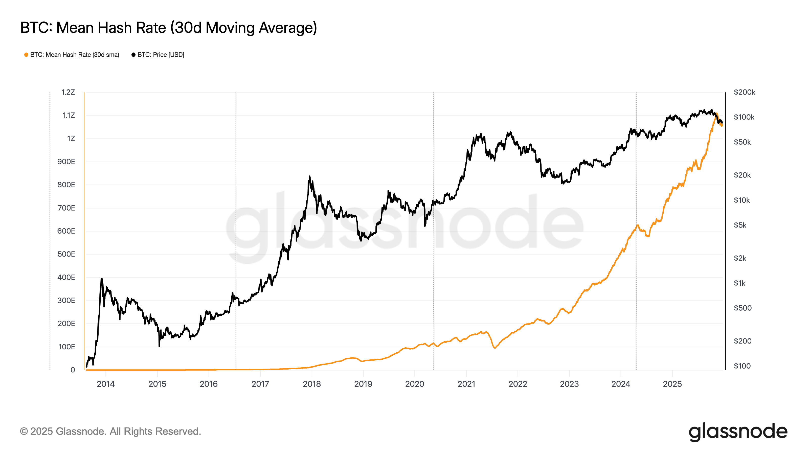 Bitcoin mean hash rate vs. price. Source: Glassnode