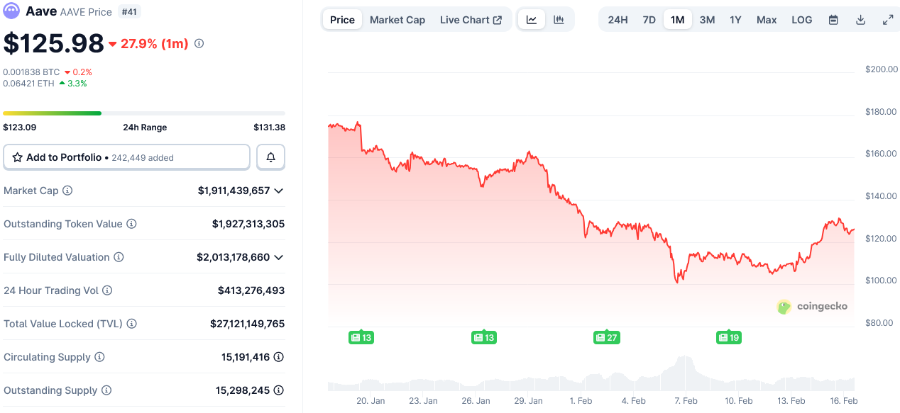 Aave is the largest DeFi protocol by total value locked, at $27 billion for borrowing and lending, DeFiLlama data shows.