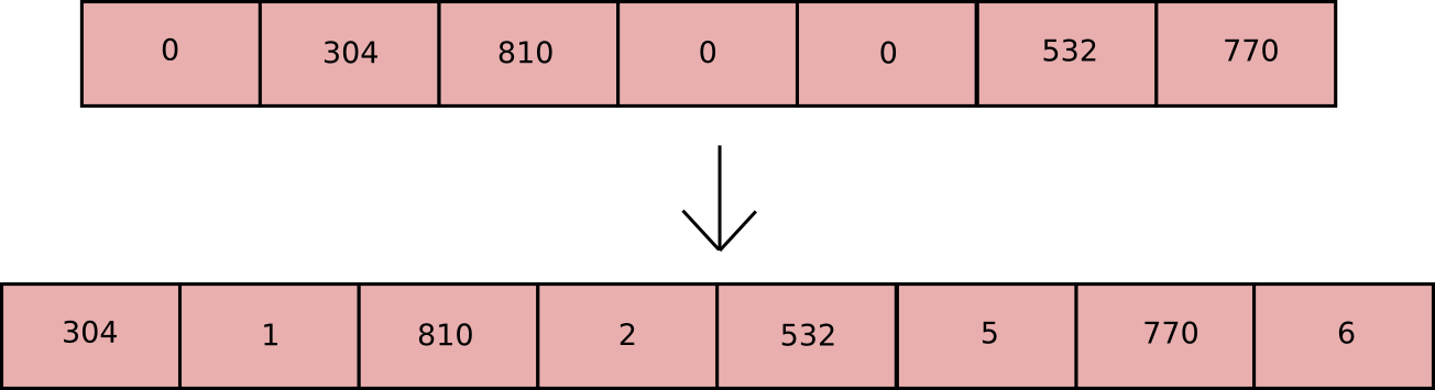 First, we use storage index 0 to store the last accessed epoch, and we check if the current epoch is higher than the last accessed epoch. If it is, then that signals the start of a new epoch, so we need to process all the votes and clear the contract for the next epoch. We start off by copying the values that have been submitted to an array (values that have not been submitted, ie. zeroes, are not put into this array). We keep two running counters, i and j; the counter i runs through all value slots, but the counter j counts only the value slots that have something inside them. Note that the array that we produce is of the form [ val1, index1, val2, index2 … ], where index1 etc are the indices of the associated values in the original values array in contract storage, thus for example, the following values would lead to the following array: