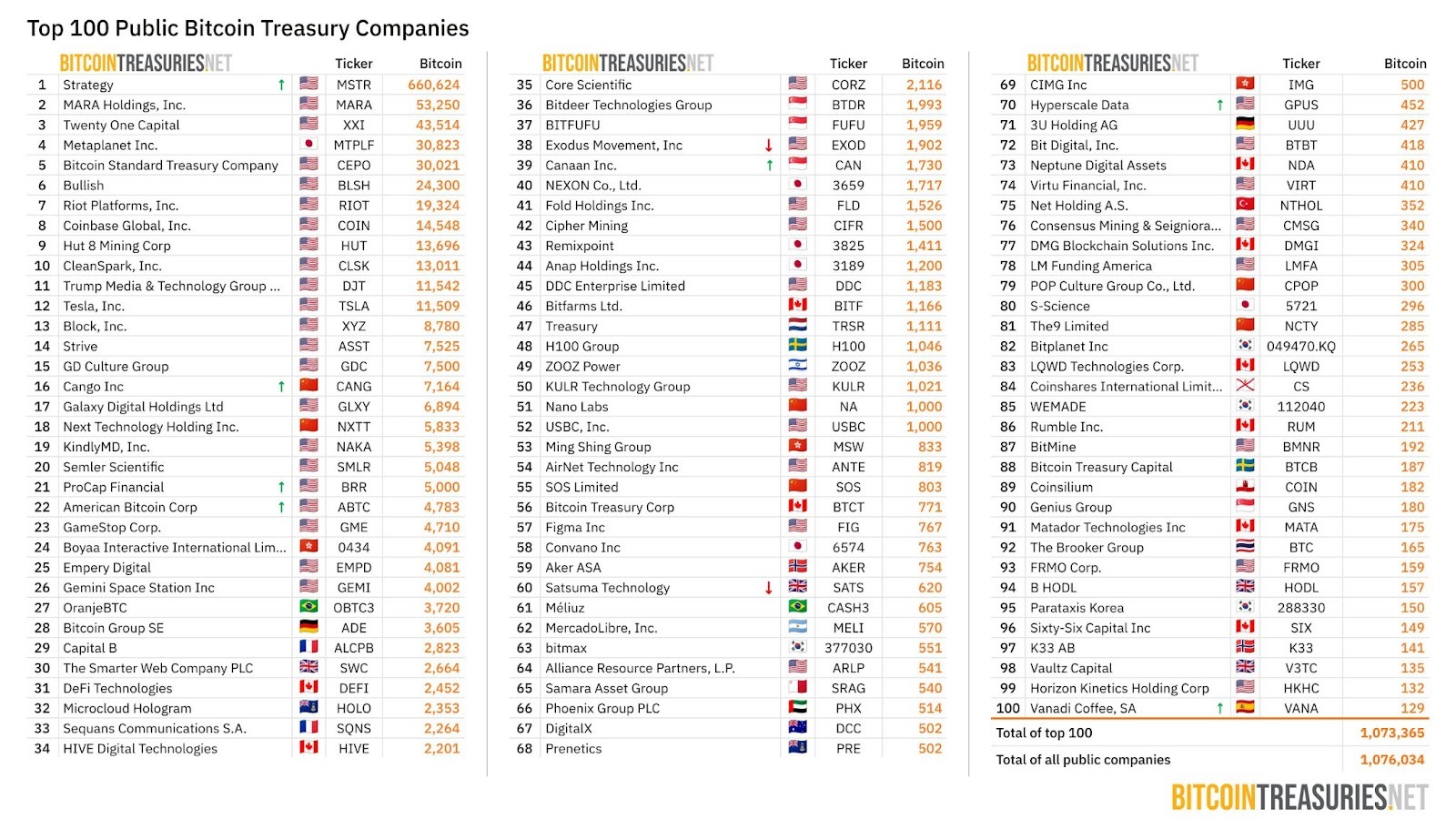 The largest public Bitcoin treasury companies. Source: BitcoinTreasuries.NET