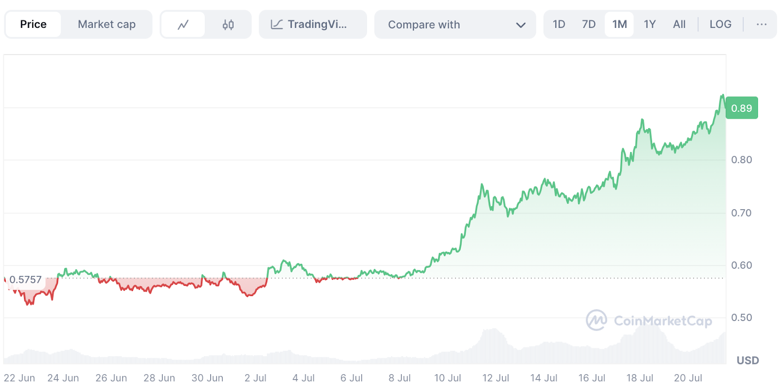 Cardano (ADA) has risen by more than 50% over the past month, buoyed by recent ecosystem launches and expanded stablecoin options. ADA’s sustained community development and regulatory alignment could be factors in its rebound.