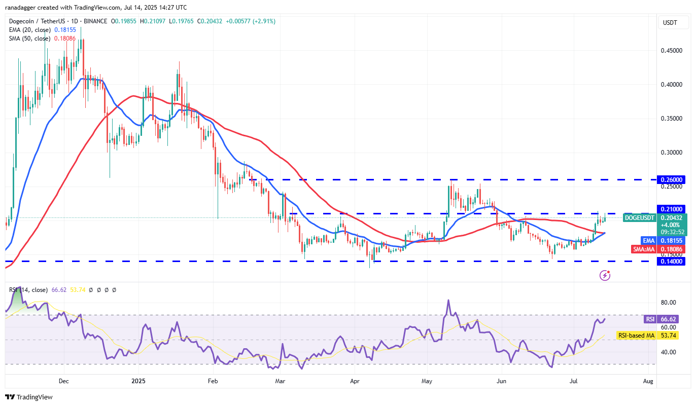 The upsloping 20-day EMA ($0.18) and the RSI near the overbought zone indicate the path of least resistance is to the upside. If buyers drive the price above $0.21, the DOGE/USDT pair could climb to $0.26. Sellers are expected to mount a vigorous defense at $0.26, but the pair could surge to $0.35 if the bulls prevail.