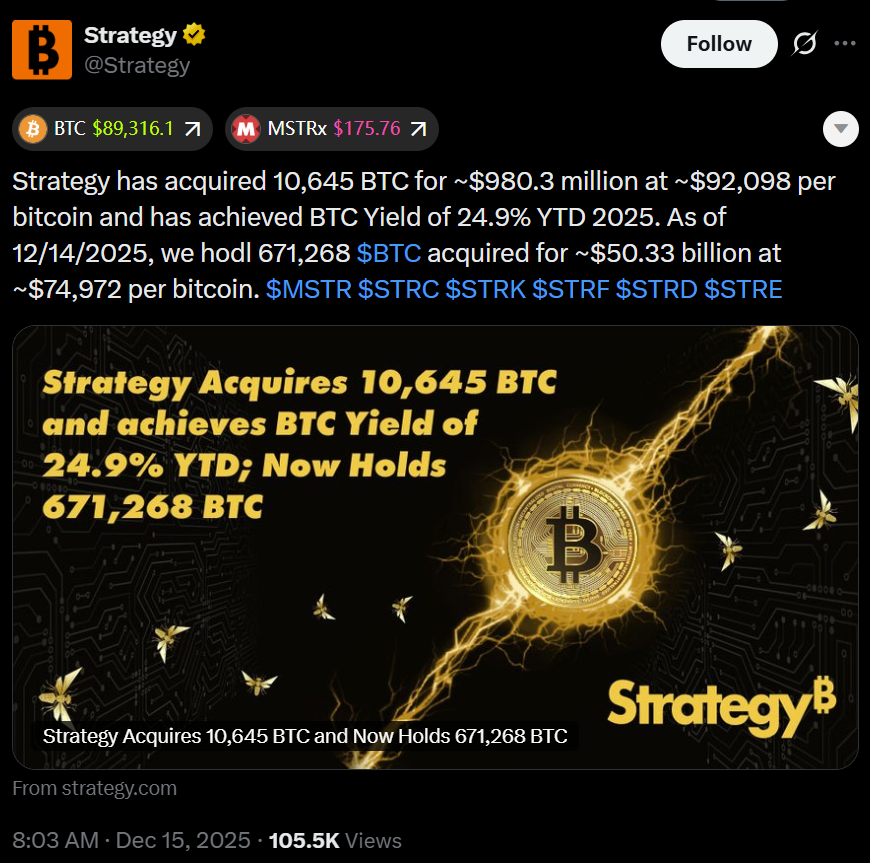 Despite the volatility, companies have continued to buy. Strategy said Monday that it acquired more than 10,000 BTC last week alone, lifting its two-week total to over 20,000 BTC.