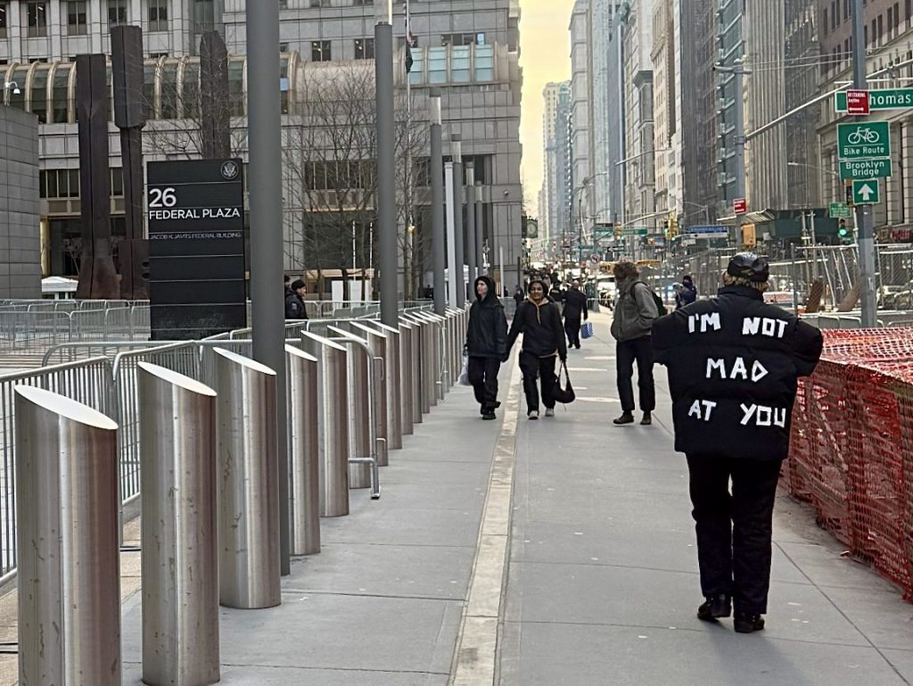“I stand with innocent people living under systemic violence. By speaking these words aloud in public, I invite passersby to reckon with what is too often unseen, unheard, or ignored,” reads a statement from Maria De Victoria, a performance artist who immigrated to the United States from Peru. (She is represented by Desnivel Gallery in New York’s East Village.) Wearing a coat emblazoned with Good’s words, De Victoria has been chanting with near-constant focus in front of the heavily barricaded Jacob K. Javits Federal Building in downtown Manhattan, just a few blocks from the New York Supreme Court.