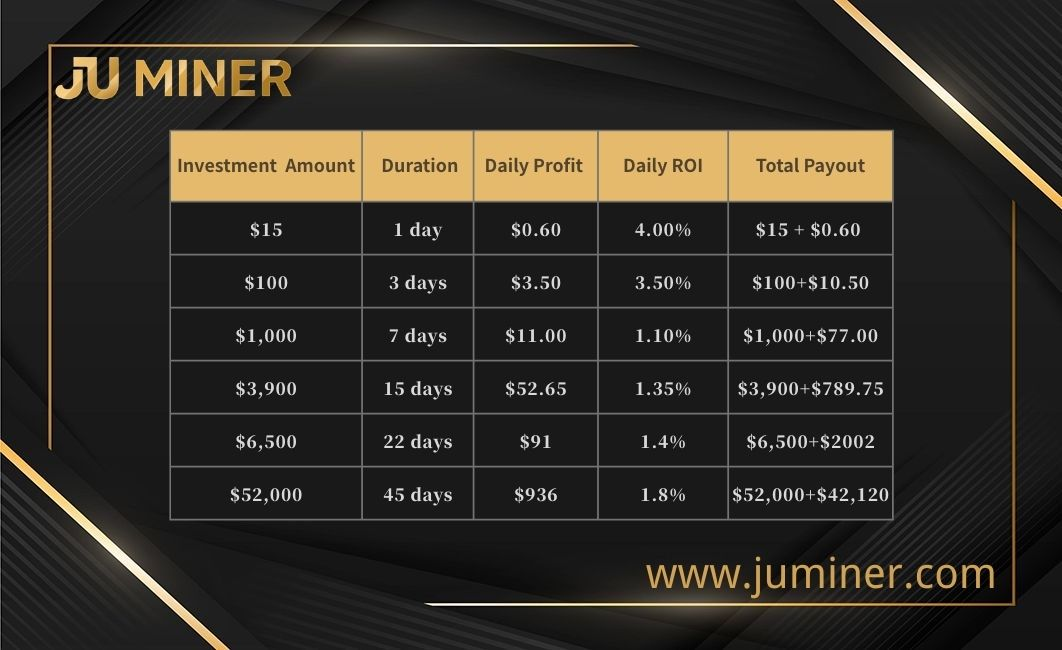 JU MINER is one such platform offering automated, eco-friendly cloud mining services. New users can register in minutes and receive a $15 welcome bonus. With a range of mining plans available — covering BTC, ETH, LTC, DOGE, and USDT — investors can choose according to their budget and risk profile. Daily payouts, strong security, and green energy usage make it a modern solution for passive crypto income.