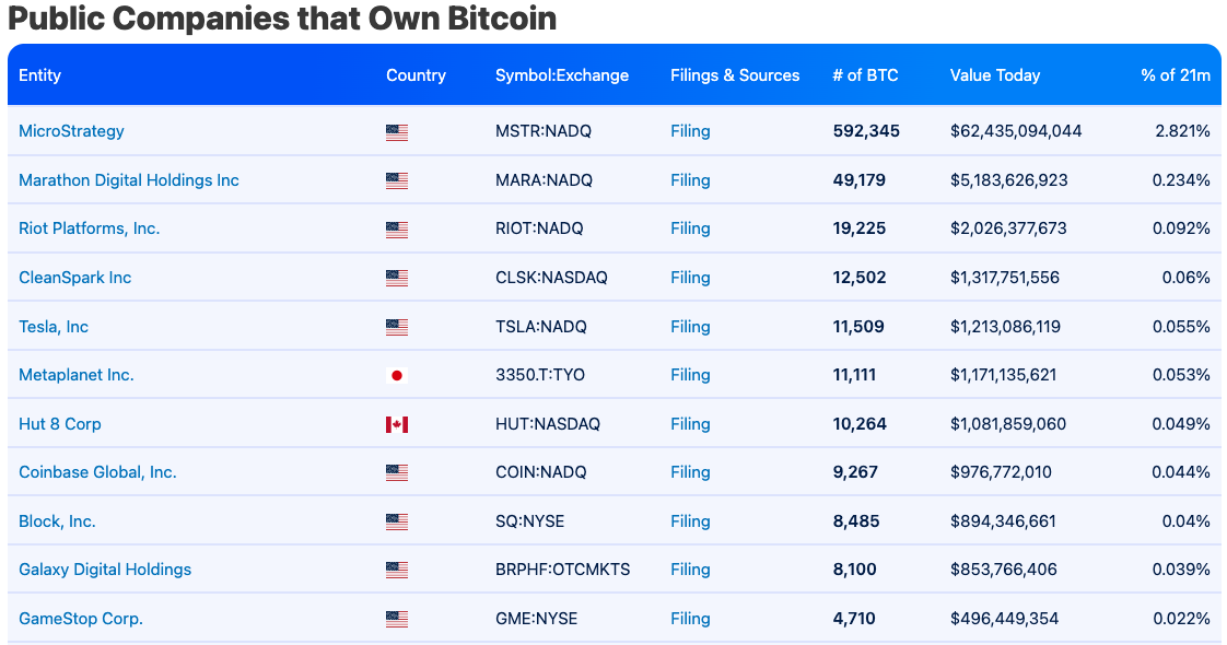 ProCap’s plan to hold $1 billion worth of Bitcoin would, as of today, place its holdings as the eighth largest among public firms, knocking down current spot holder Coinbase, which has 9,267 BTC worth nearly $974 million, per Bitbo data.