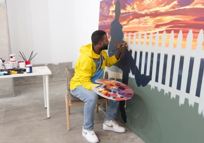 That residency model feeds directly into the FOG presentation. Elangwe, a Cameroonian-born painter now based in San Antonio, spent seven weeks in San Francisco photographing local residents and absorbing the city’s rhythms. The resulting paintings place his subjects against recognizable Bay Area backdrops, weaving portraiture into place with a steady hand and an eye for bombastic color that still feels rooted in reality.