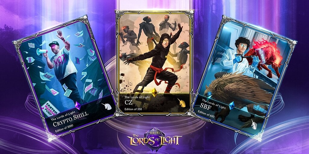 The Lords of Light has a fantasy theme, much like Hearthstone and Gods Unchained, but also leaned heavily into crypto culture and embraced humor, with cards that referenced Dogecoin, pseudonymous Bitcoin creator Satoshi Nakamoto, and disgraced FTX founder Sam Bankman-Fried.