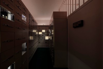 For its participation, Zurich-based gallery suns.works has chosen to make the most of the former bank by cracking open the vault—literally. Located in the building’s basement, Bijoux Solaires transforms this room made for hoarding and hiding away wealth into a glittering jewelry boutique where everything is for sale. Themed around the summer solstice, the offerings here come from seasoned jewelers as well as artists experimenting with adornment as medium. Among the antiques are jewelry once owned by Meret Oppenheim and Andy Warhol. The rings by artist Johanna Dahm are not to be missed. Each is made of one 20-gram gold bar from the former banking juggernaut Credit Suisse, expertly hollowed out with one round fired from a machine gun.
