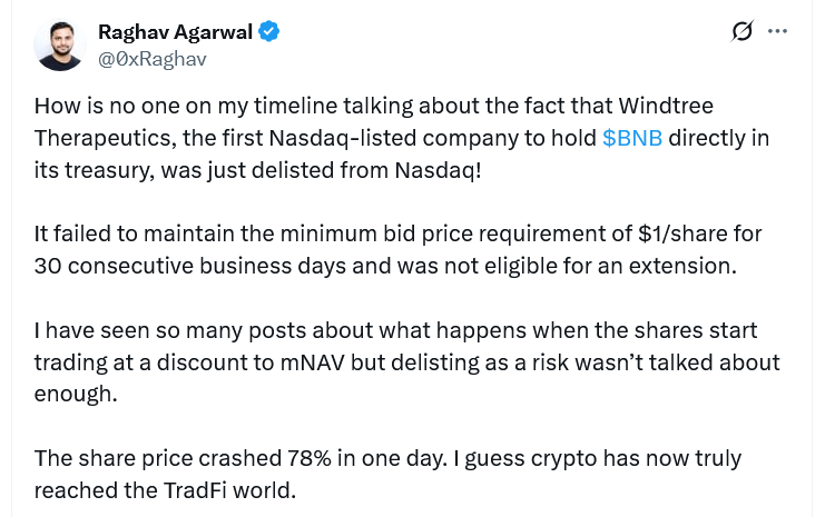 Windtree Therapeutics, a biotech company that established a BNB treasury strategy last month, fell 77% on Wednesday after the Nasdaq informed the firm it would be delisted from the stock exchange for failing to meet compliance requirements.