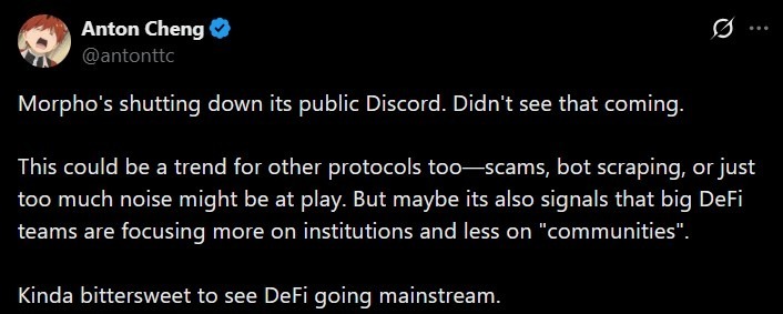 The concern is not limited to Morpho. DeFi data platform DefiLlama’s pseudonymous founder 0xngmi said they have been quietly reducing their reliance on Discord, favoring more controlled communication tools.