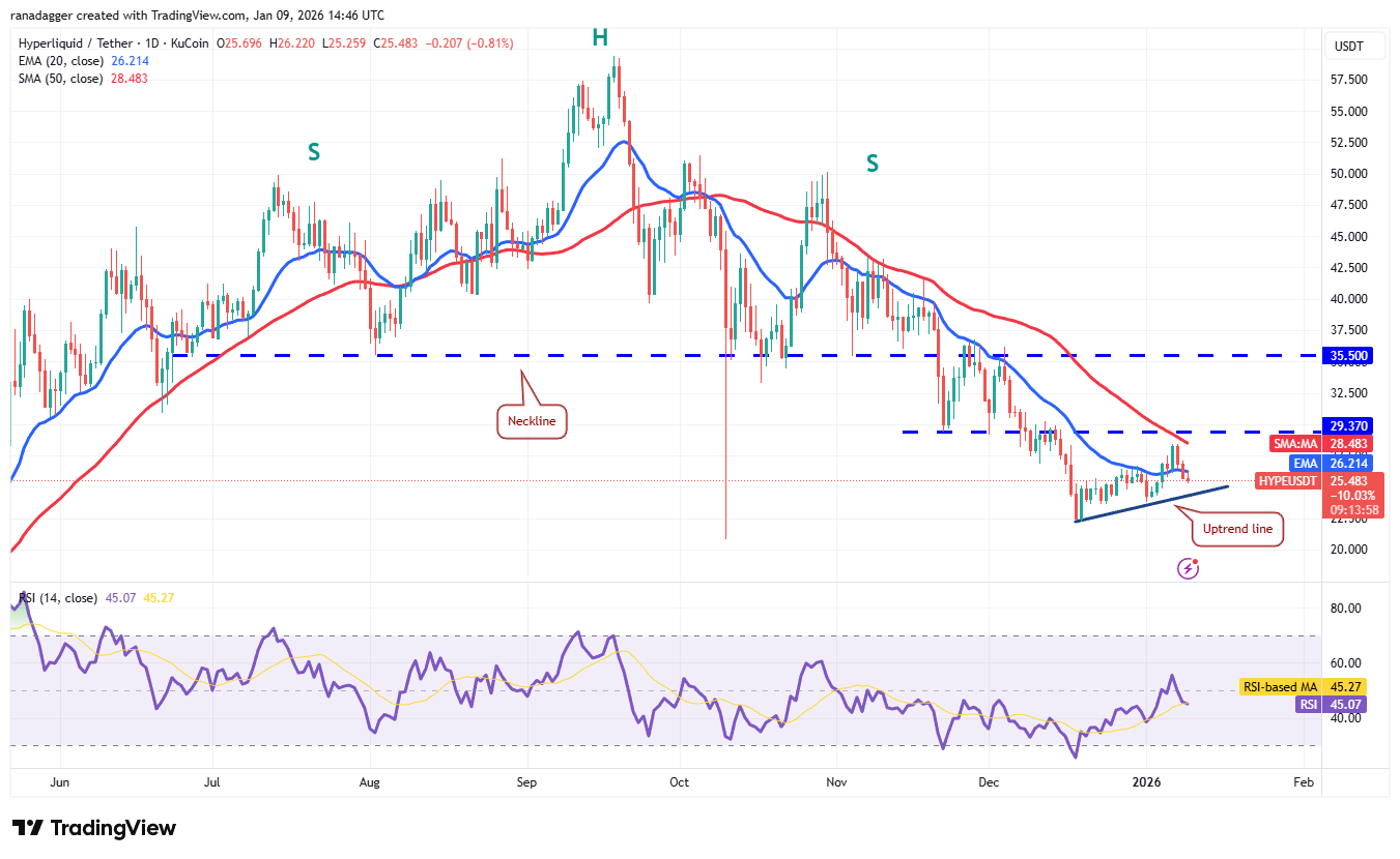 Hyperliquid (HYPE) turned down from the 50-day simple moving average ($28.48) on Wednesday and slipped below the 20-day EMA ($26.21) on Thursday.