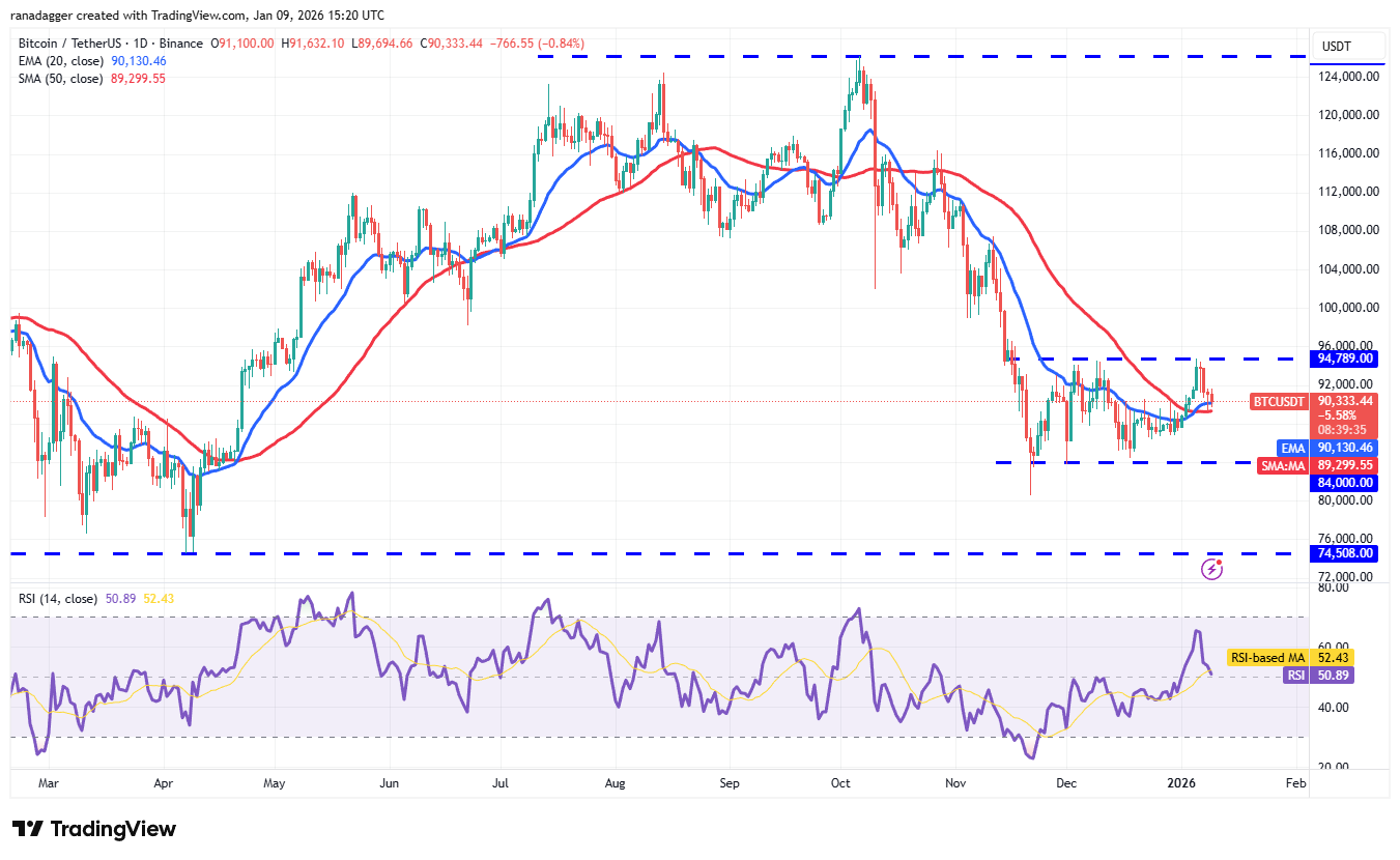 Both moving averages are flattening out, and the relative strength index (RSI) is at the midpoint, indicating a balance between supply and demand. The advantage will tilt in favor of the bulls if they push the Bitcoin price above the $94,789 resistance. The BTC/USDT pair could then skyrocket to the psychological level of $100,000.