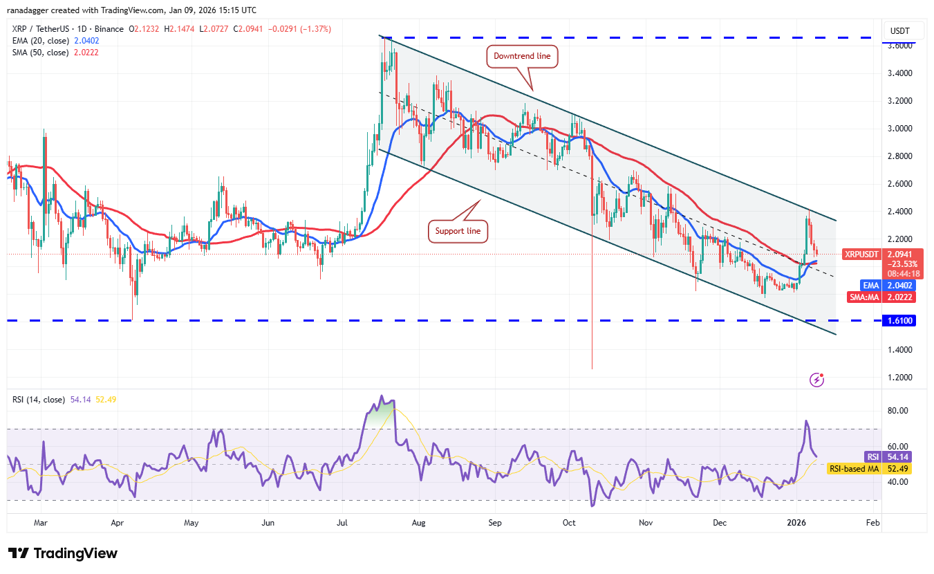 The upsloping 20-day exponential moving average ($2.04) and the RSI in the positive zone signal that buyers have an edge. If the price rebounds off the moving averages with strength, the possibility of a break above the downtrend line increases. If that happens, the XRP/USDT pair could rally toward $2.70, signaling a trend change.
