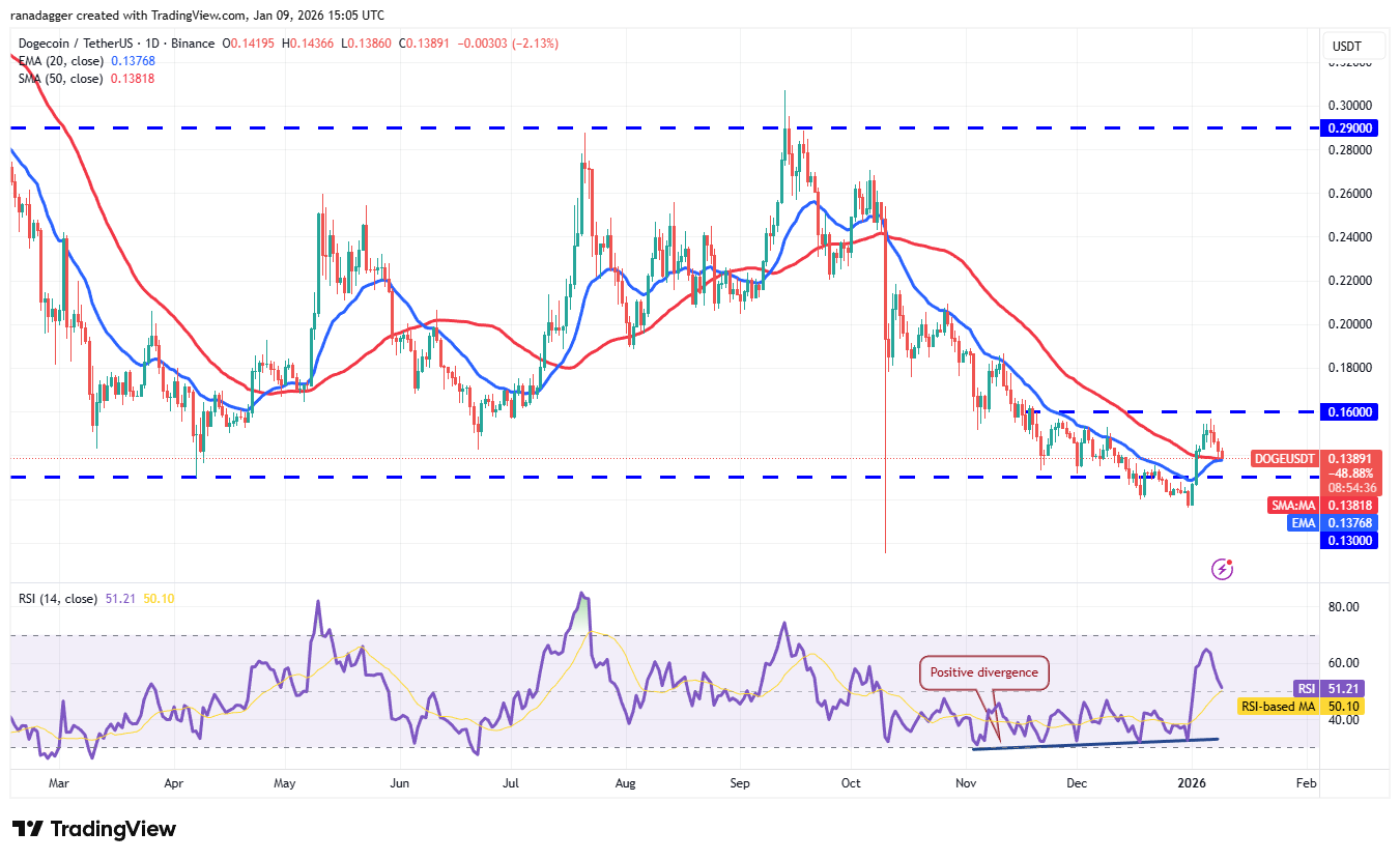 The 20-day EMA ($0.14) is turning up gradually, and the RSI is just above the midpoint, indicating a slight edge to the buyers. A close above the $0.16 level suggests that the market has rejected the break below the $0.13 support. The DOGE/USDT pair may then climb to $0.19.