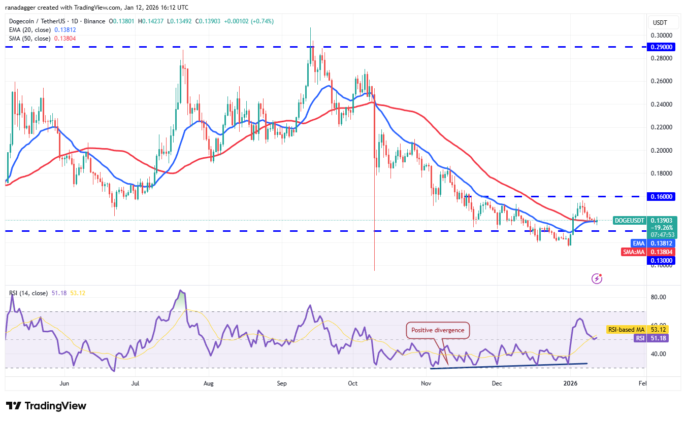 The flattish moving averages and the RSI near the midpoint do not give a clear advantage either to the bulls or the bears. If the price slumps below the moving averages, the DOGE/USDT pair could descend to $0.13 and then to $0.12.