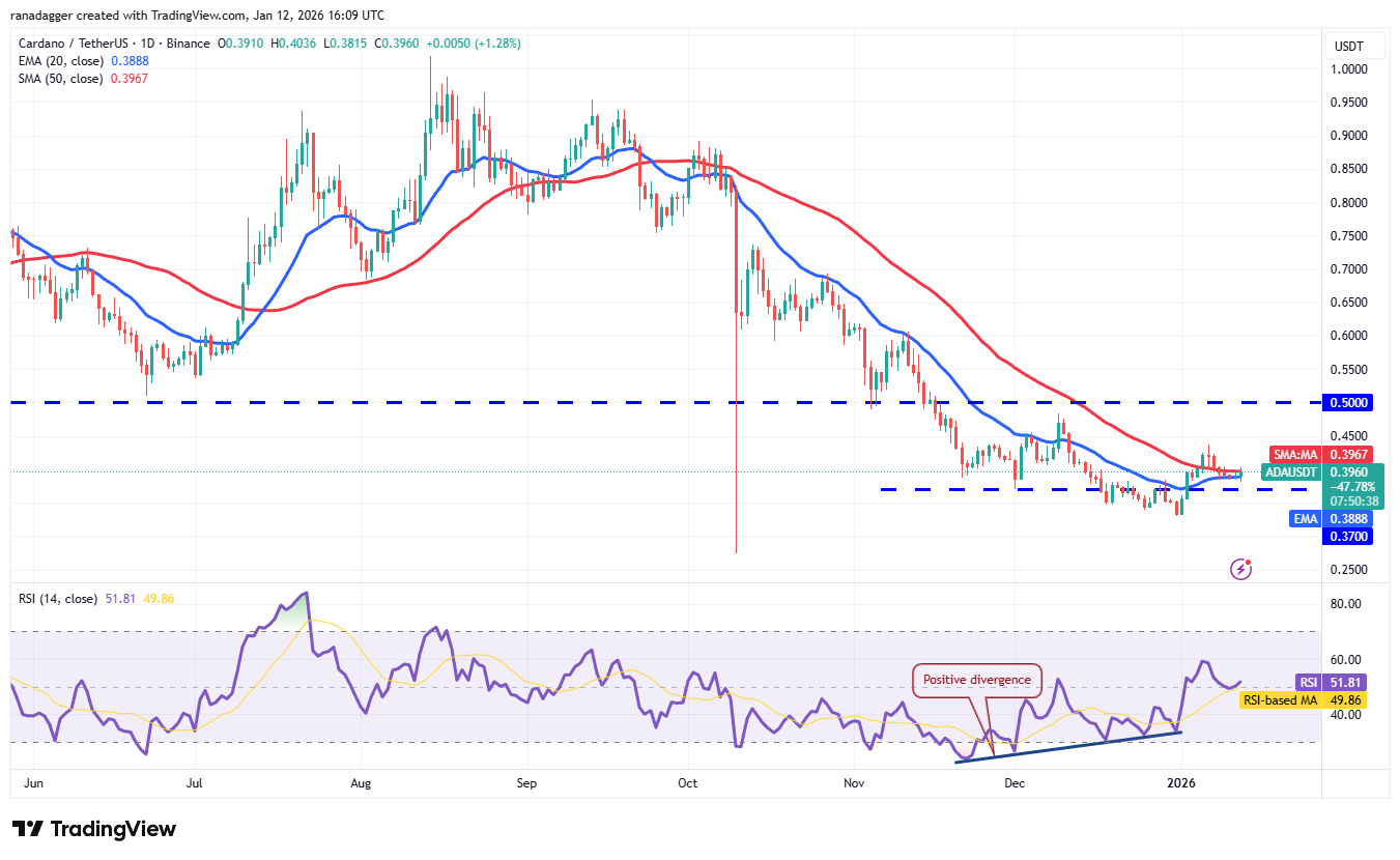 Buyers are attempting to maintain Cardano (ADA) above the moving averages, but the weak bounce heightens the risk of a breakdown.