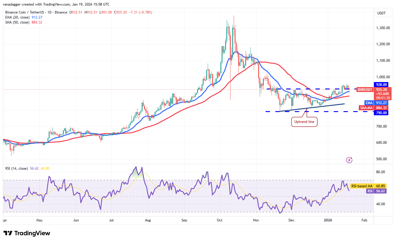 Sellers pulled the BNB (BNB) price below the 20-day EMA ($912) on Monday, but the long tail on the candlestick shows buying at lower levels.