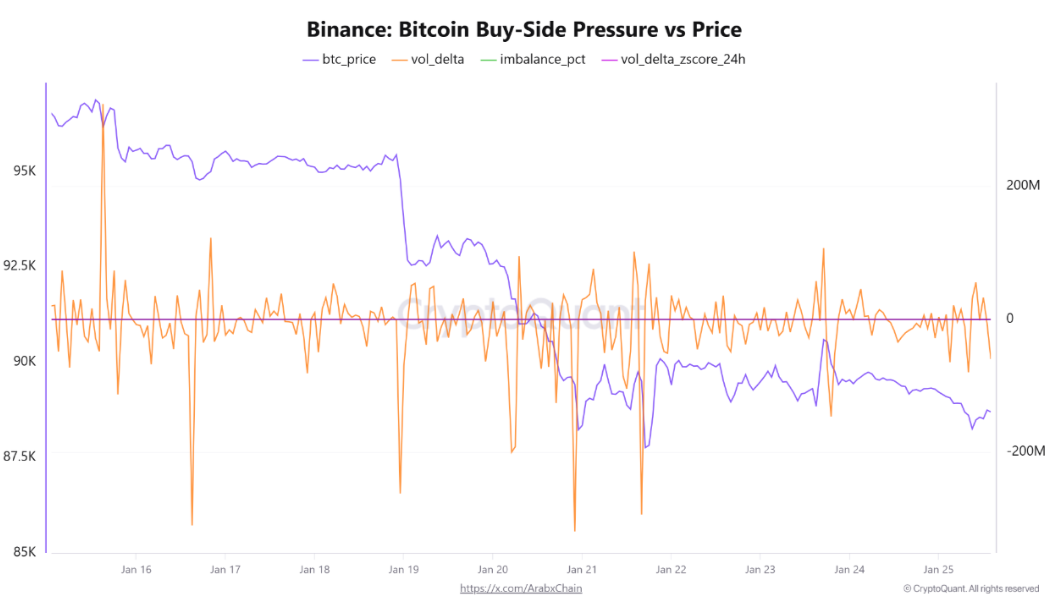 Volume delta z-score readings, it added, represented “short-term tactical selling pressure rather than a phase of panic or widespread forced liquidation.”