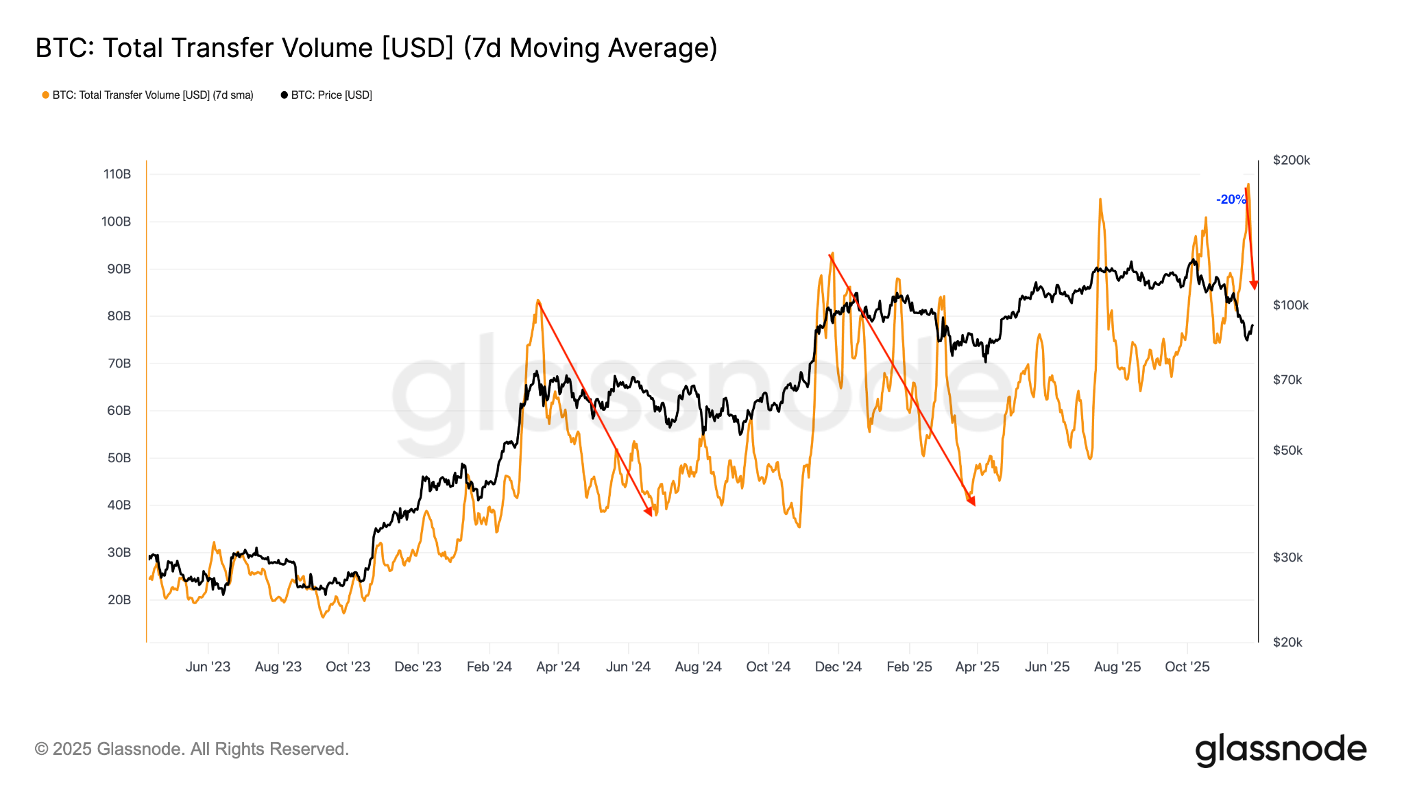 The seven-day moving average of onchain transfer volume has dropped by about 20% to $87 billion over the last week.