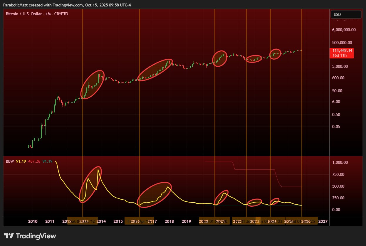 “Monthly Bollinger Bands have reached the most extreme levels in Bitcoin’s entire history,” he wrote on X.