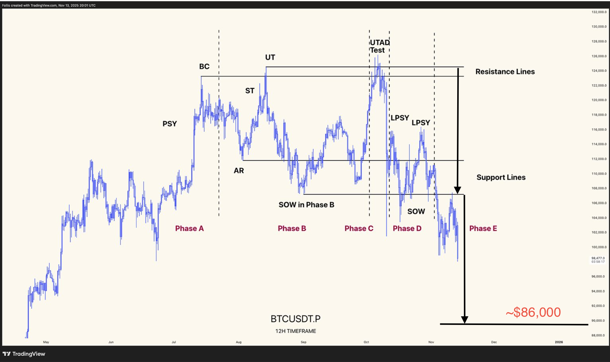 • Bitcoin’s drop below $100,000 comes as a Wyckoff Distribution pattern points to a potential decline toward $86,000.