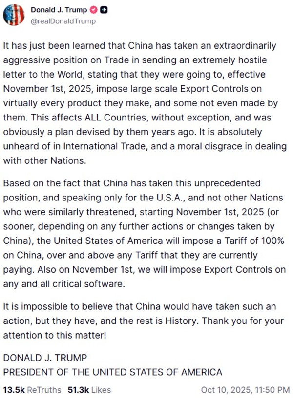 The immediate catalyst, however, was a social media post by President Trump threatening 100% tariffs on Chinese imports. The comment triggered a sharp sell-off across both crypto and equity markets.