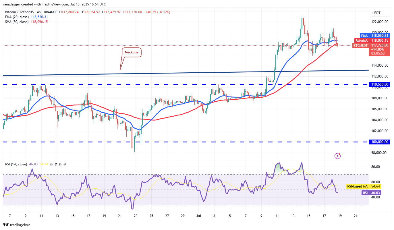 The price has slipped below the 50-day simple moving average (SMA), indicating that the bulls are losing their grip. The pair could drop to $115,000, which is an essential level for the bulls to defend. If they fail to do that, the pair may challenge the zone between the neckline of the inverse head-and-shoulders pattern and the $110,530 support.