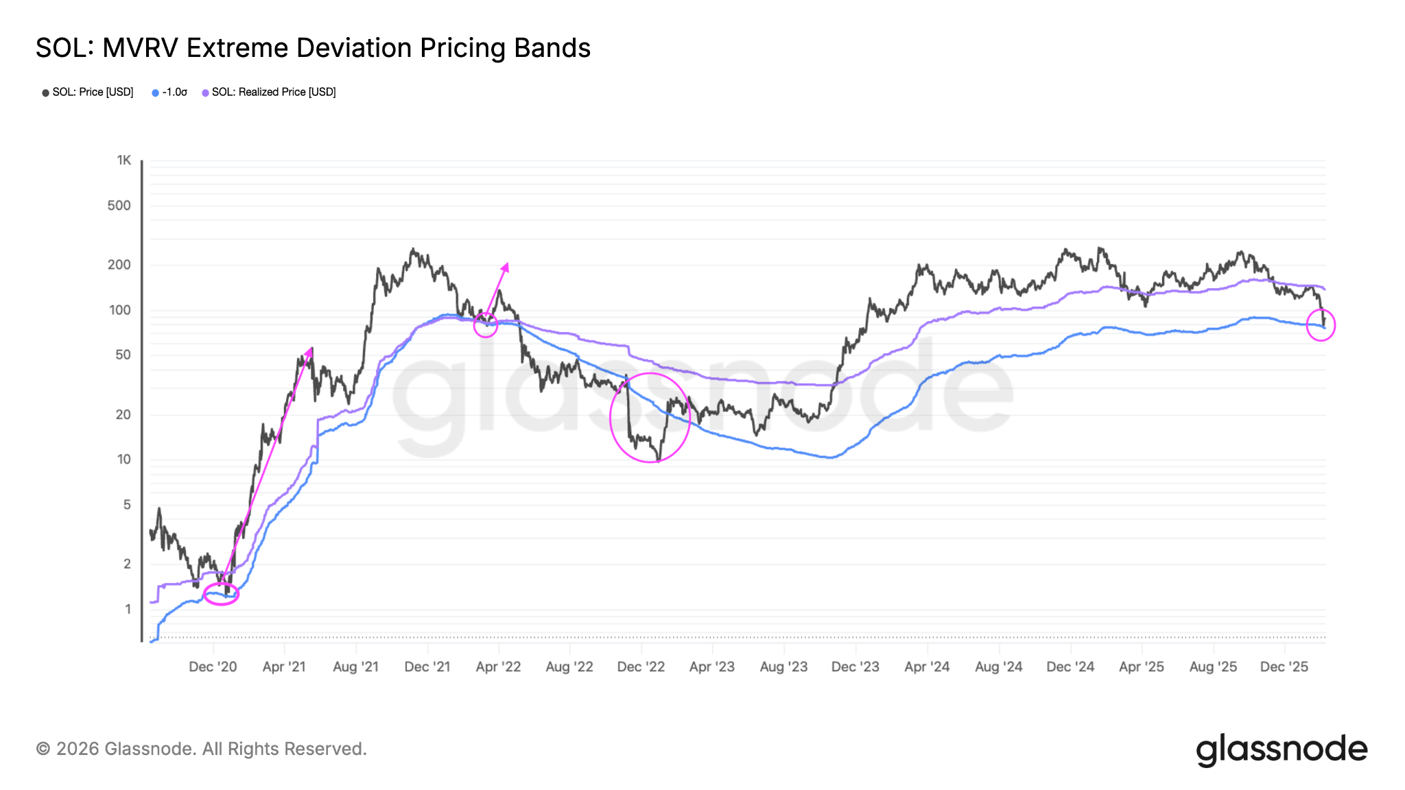 That includes the March 2022 bounce, when the SOL price rose 87% within three weeks to $140 after testing the lowest MVRV deviation band around $75. A similar rebound occurred earlier in December 2020.
