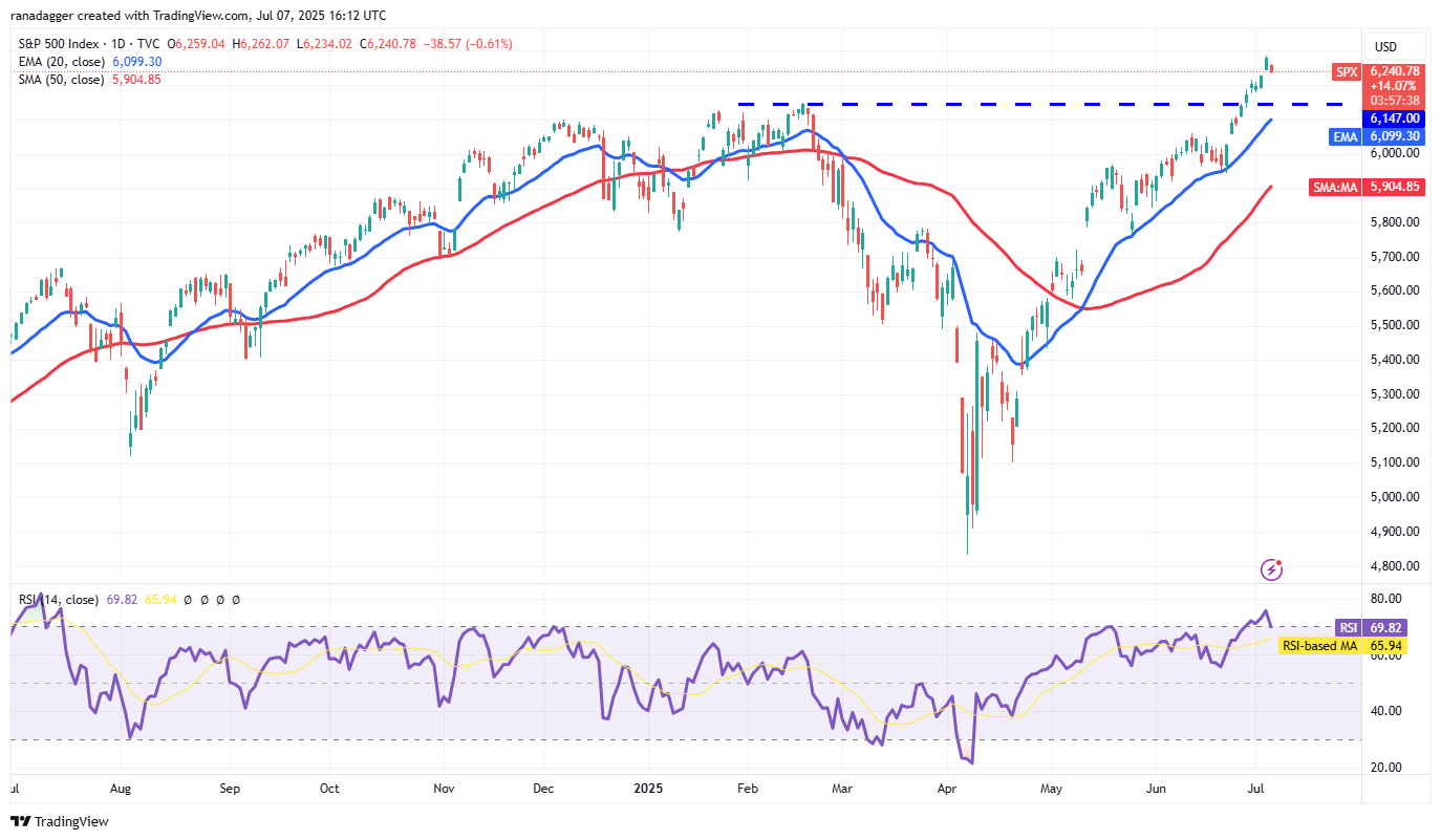 Sellers will have to yank the price below the 20-day exponential moving average (6,099) to weaken the bullish momentum. The index may then plummet to the 50-day simple moving average (5,904).