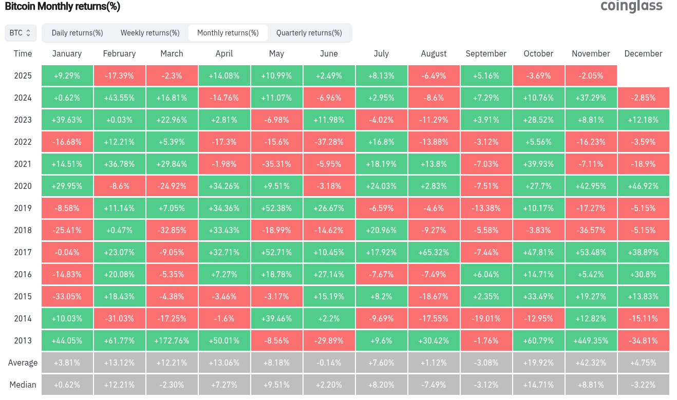 BTC/USD monthly returns (screenshot). Source; CoinGlass