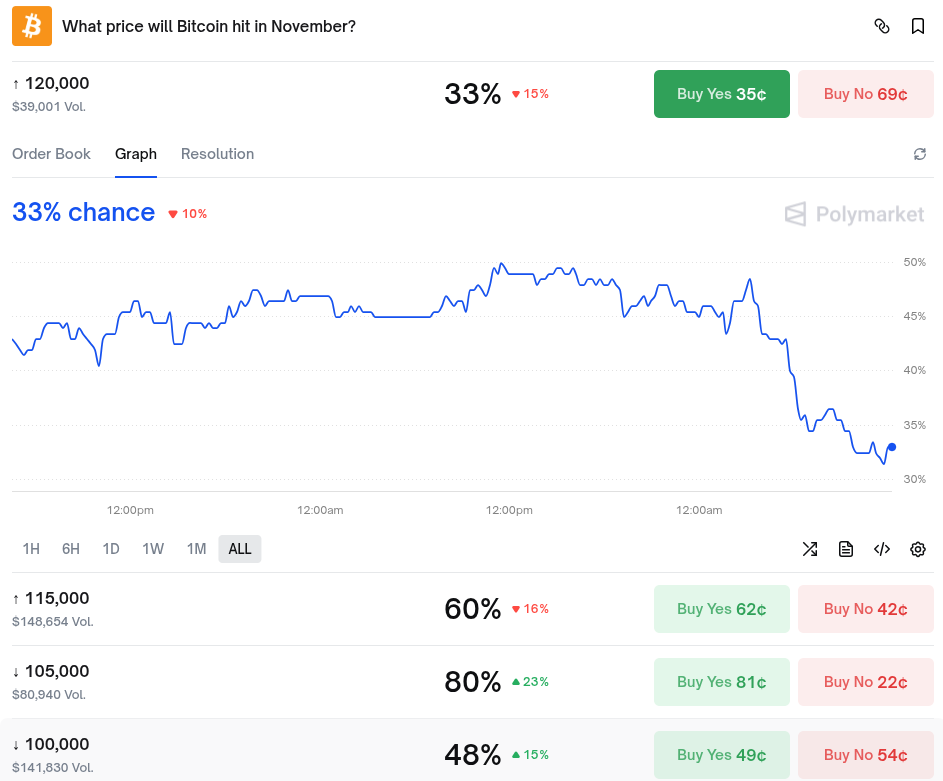 Prediction markets underscore the current low sentiment among crypto market participants. Polymarket has just a 33% chance of BTC/USD finishing the month above $120,000, with $115,000 at 60%.