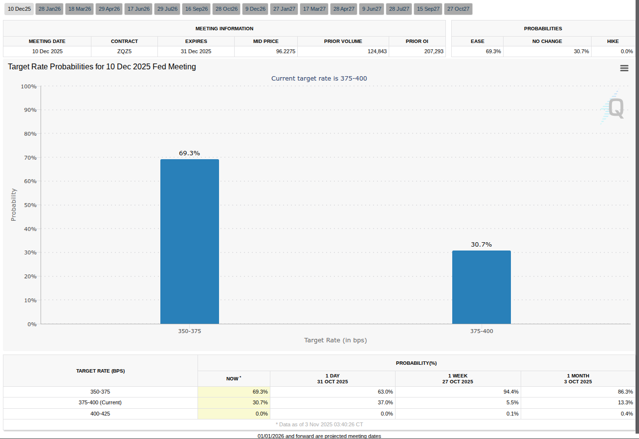 Data from CME Group’s FedWatch Tool puts the odds of a cut at the Fed’s next meeting in December at 63%.