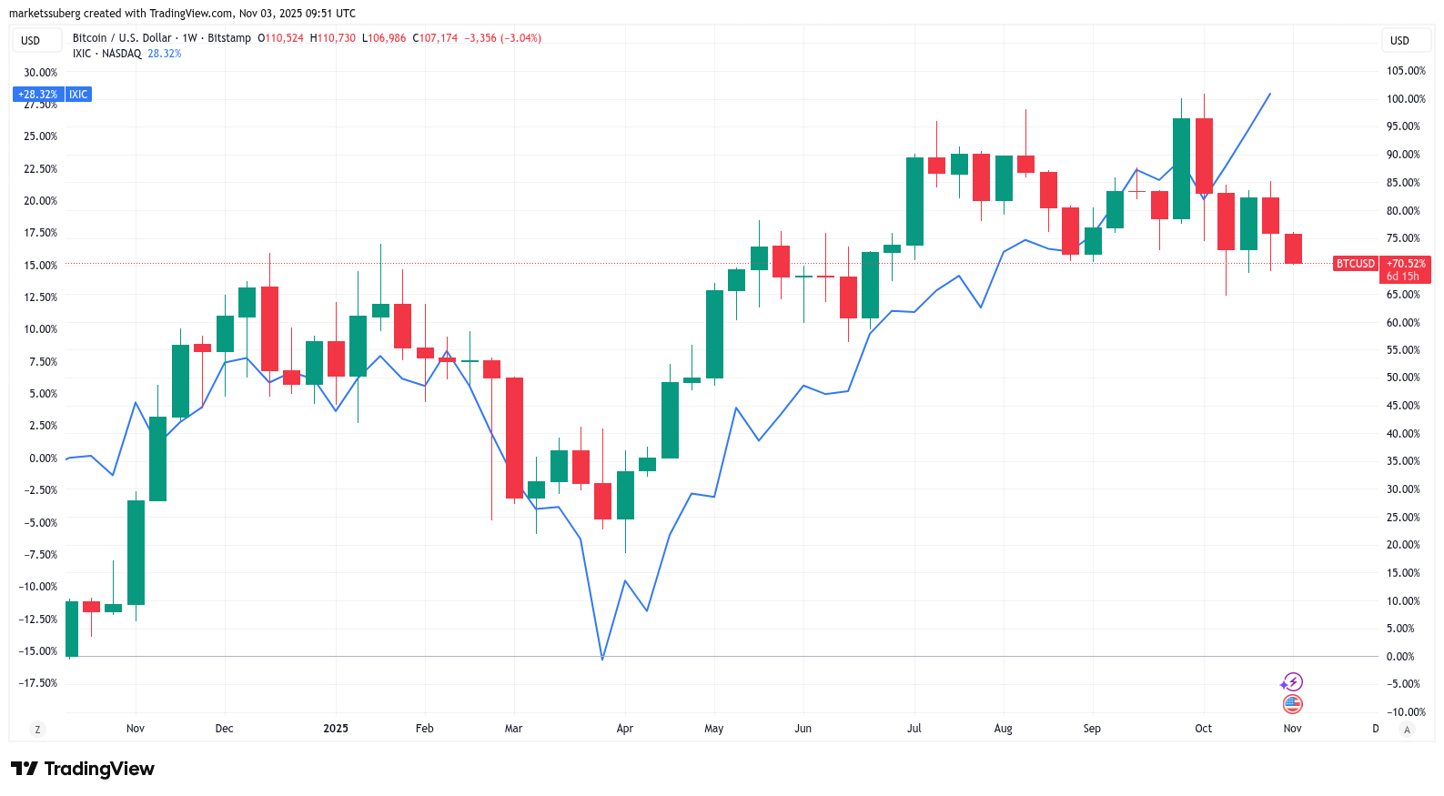 BTC/USD vs. Nasdaq Composite Index one-week chart. Source: Cointelegraph/TradingView