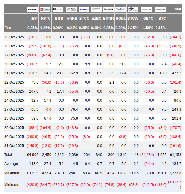 Data from UK-based investment firm Farside Investors shows three consecutive days of net outflows from the US spot Bitcoin exchange-traded funds (ETFs) through Oct. 31.
