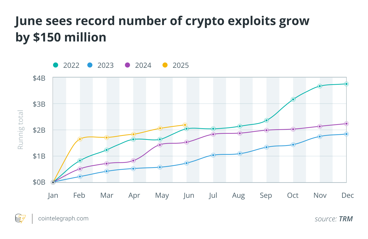 Losses in June bring the total amount of crypto lost in hacks and exploits this year up to $2.15 billion, according to a report by TRM Labs — $500 million higher than the same time frame for 2024.