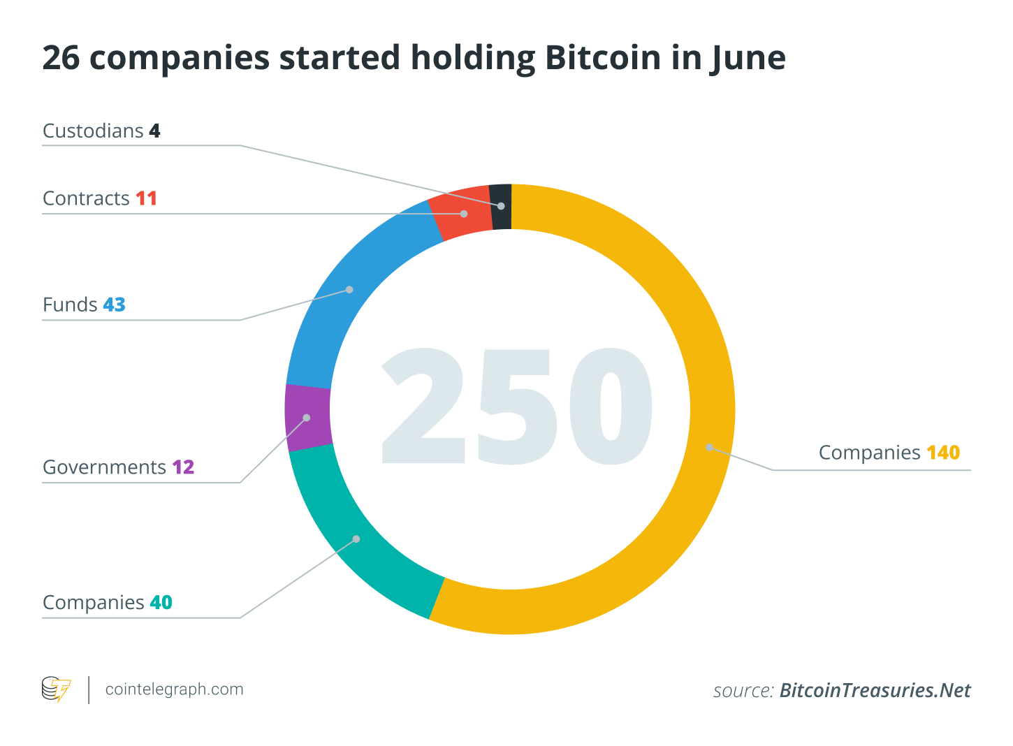 A growing number of companies are adding Bitcoin to their balance sheets after seeing the success of software company Strategy. Some 26 companies added the asset to their balance sheet, bringing the total number of companies with Bitcoin in their treasuries up to 250.