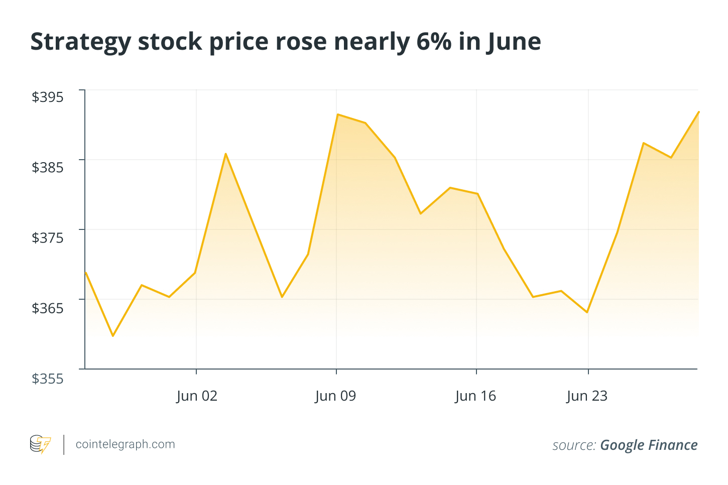 Saylor’s tactic of issuing debt to fund these Bitcoin purchases has gained ground; Strategy’s company’s stock price, despite increased issuances, has continued to grow. In June, MSTR gained 6%.