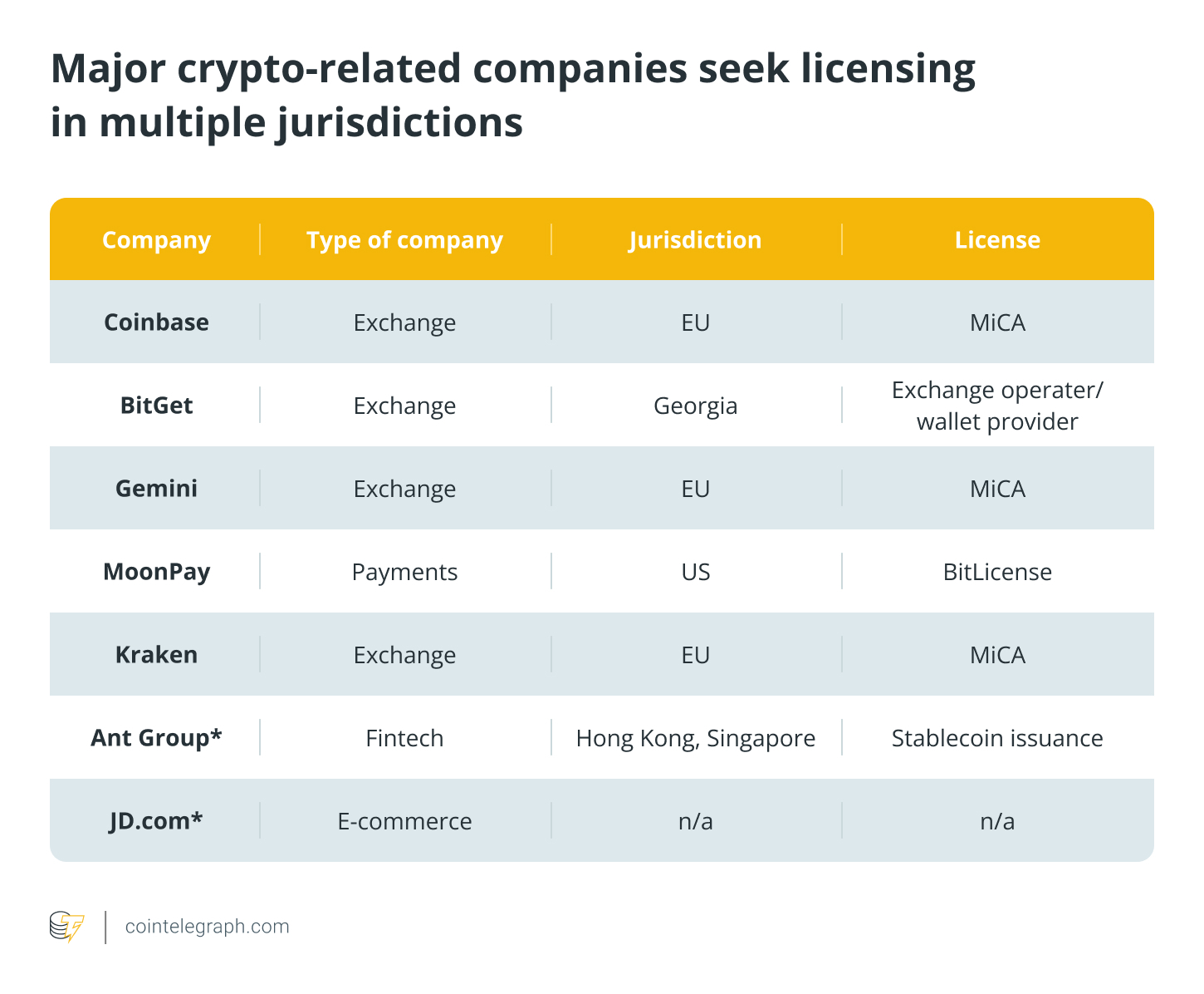 Bitget secured a license in the Caucasian country of Georgia, while crypto payments-related firm MoonPay scored a BitLicense from New York state regulators in the US.