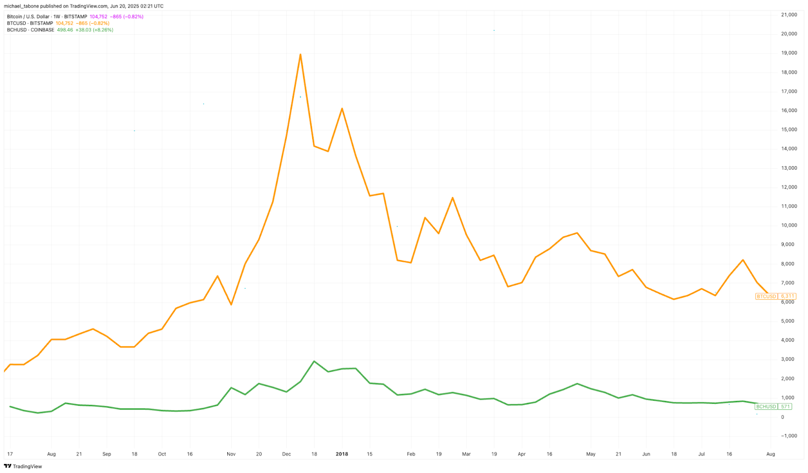 However, this dip proved short-lived. Throughout August, BTC surged nearly 49%, closing strong at around $4,050, and continued its meteoric rise to almost $20,000 by December 2017. Meanwhile, Bitcoin Cash (BCH) launched trading at approximately 0.0045 BTC (~$240) and skyrocketed to 0.283 BTC (~$1,500) before stabilizing in the $300-$500 range.