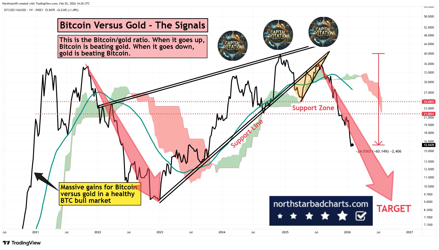 “Note, this was the first cycle where Bitcoin DID NOT make big new highs against gold. Worse may be to come due to capital rotation,” they told X followers.