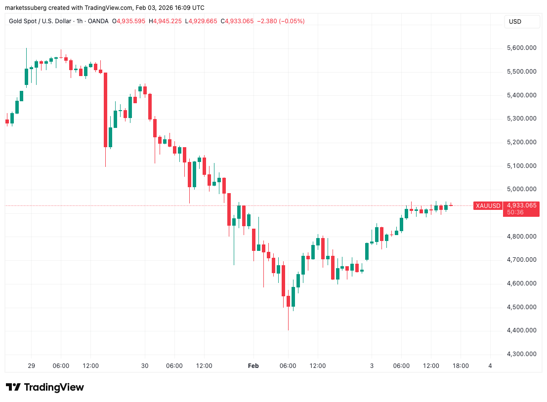 XAU/USD rebounded to $4,971, up more than $500 versus Monday’s local lows.