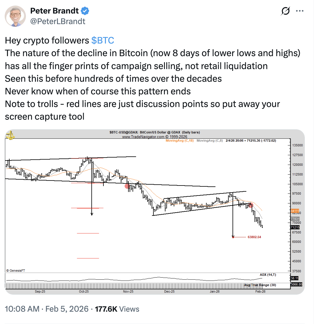 • Brandt says “campaign selling” is pressuring BTC, with miners and ETFs also cutting exposure.