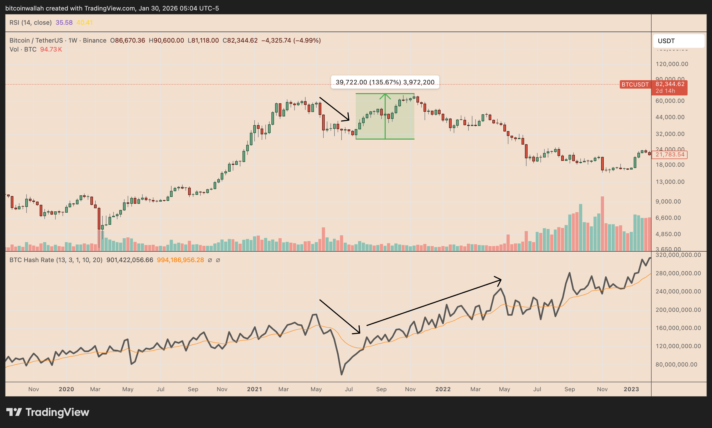 BTC/USDT vs. hash rate weekly chart. Source: TradingView